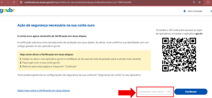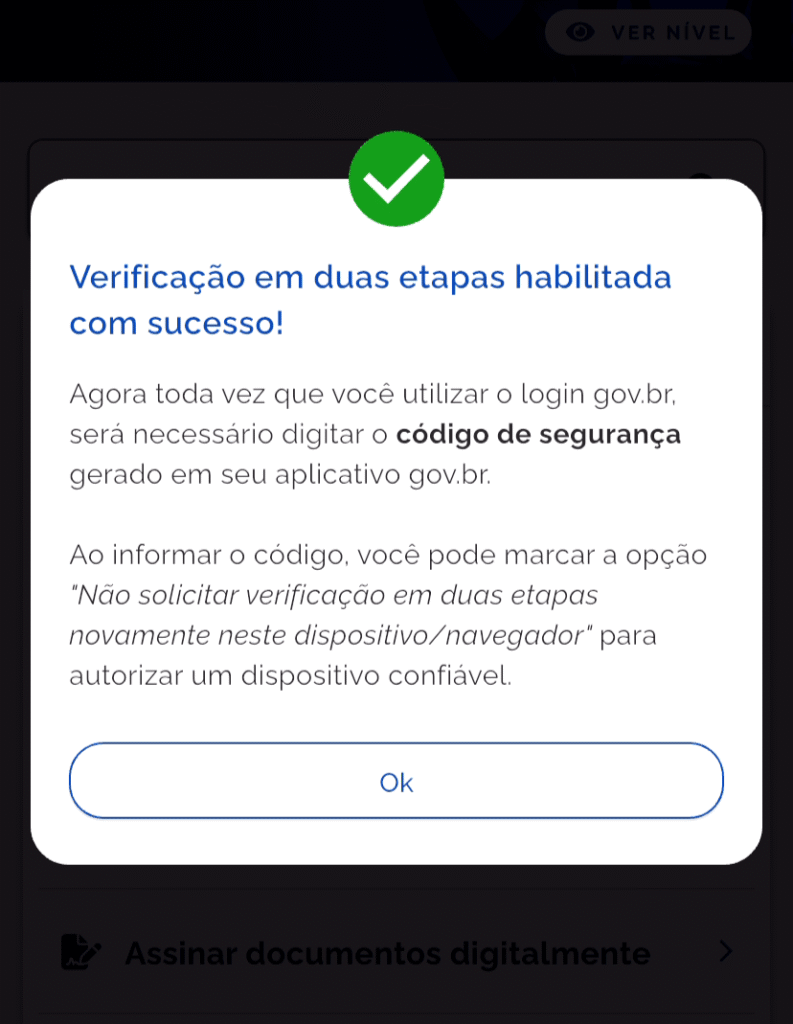 Após ele confirmar, será exibida uma explicação, de que a partir de agora sempre será necessário gerar um código de segurança para acessar qualquer serviço via Gov.br.