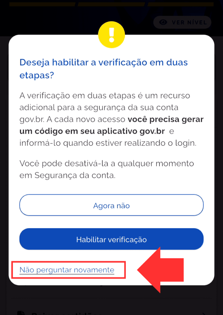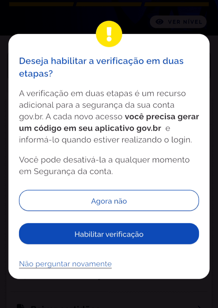 Passo 3: Mesmo marcando para não perguntar novamente, a mensagem pode voltar a ser exibida de tempos em tempos, ao acessar de um aparelho diferente ou após uma atualização, afinal o governo quer que mais usuários passem a utilizar essa proteção adicional. Eduque o seu cliente – explicando o que foi feito, e que caso veja o alerta novamente, não deve ativá-lo.